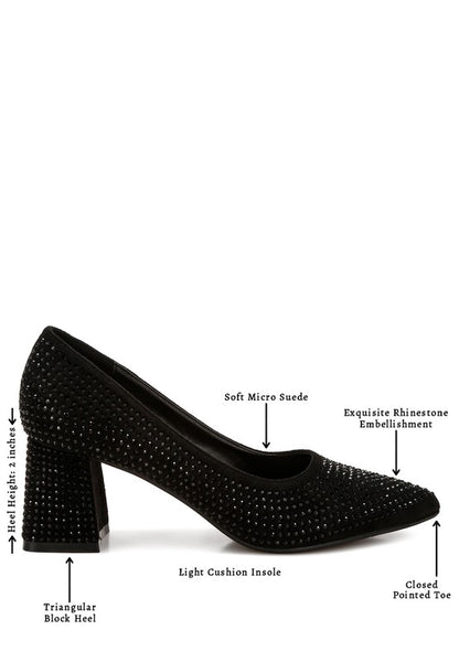 The block heel pumps are comfortable with a plush cushion insole and exhibit a glamorous aesthetic with the rhinestone embellishments. The pump shoes are great for occasions when you want to be comfortable but still look stylish from day to night!