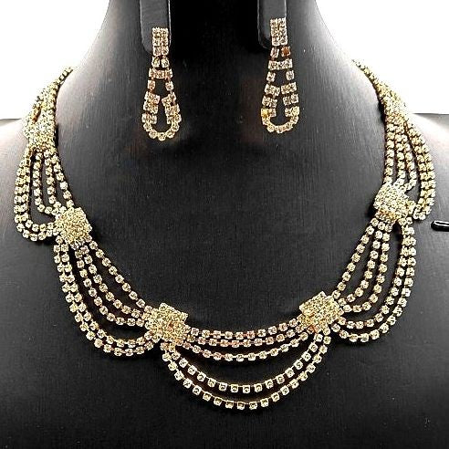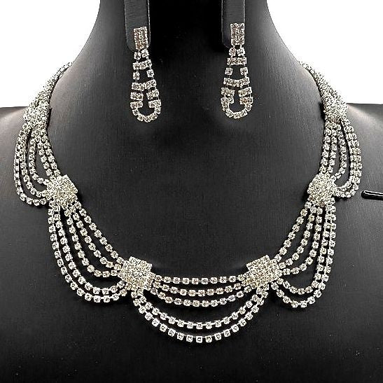 - Curtain Dress Rhinestone Necklace Set is a stunning jewelry set that includes a glamorous rhinestone necklace and earrings.