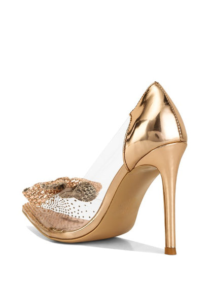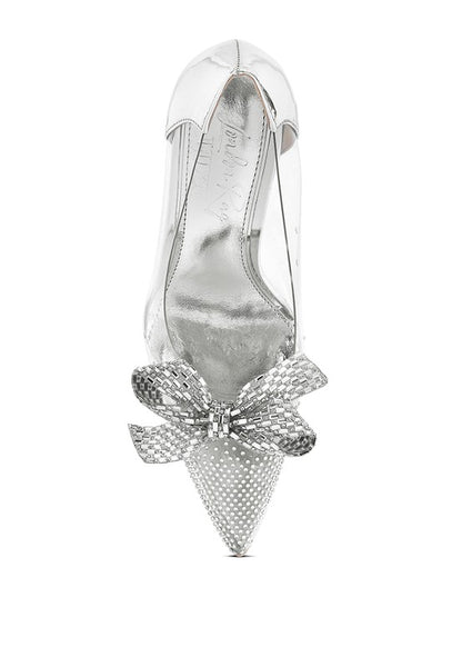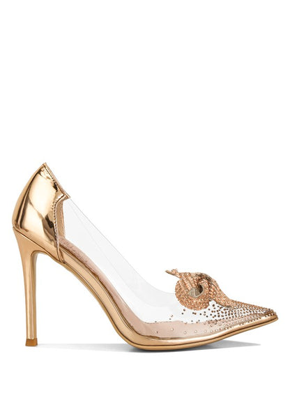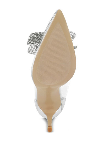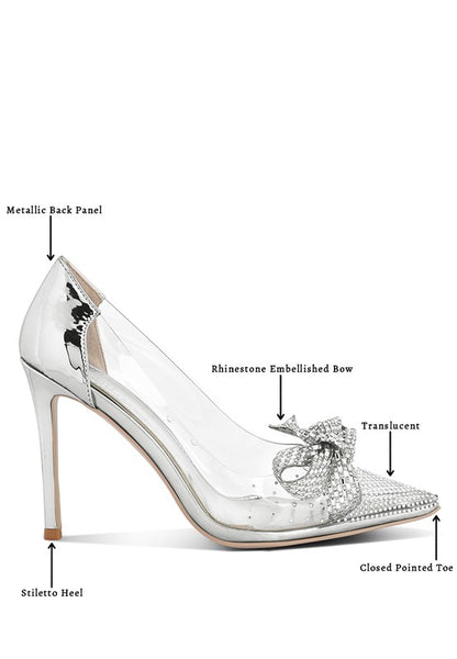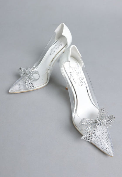 Like a modern-day Cinderella, step into your new beginning looking like an elegant and alluring princess. The beautifully embellished rhinestones on the pumps look like glistening diamond droplets exhibiting opulence and vogue which would look stunning as wedding heels. The embellished bow amplifies the look of the clear pumps while the cushioned insoles cut strain making them a comfortable pair for special occasions.