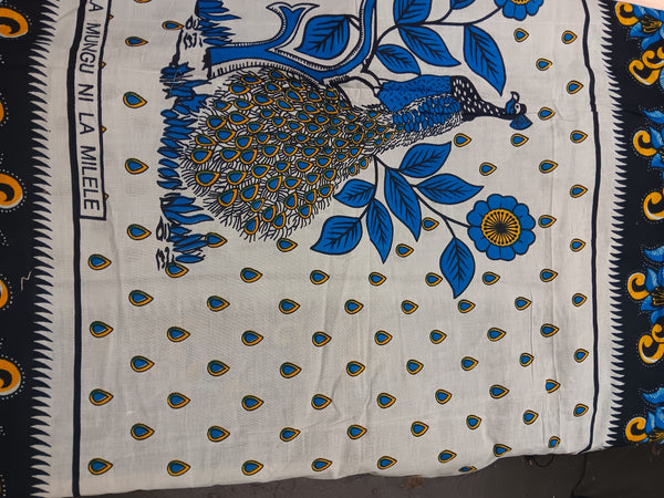 So Elegant...So Beautiful! This scarf will go lovely with your outfit. Gorgeous Blue/Gold/Black large Peacock and floral design print made in Africa. Accented with a lovely black and gold boarder. A Great Addition to Your Wardrobe.