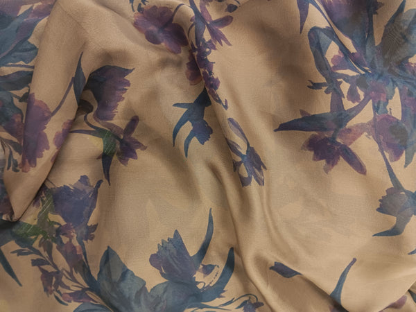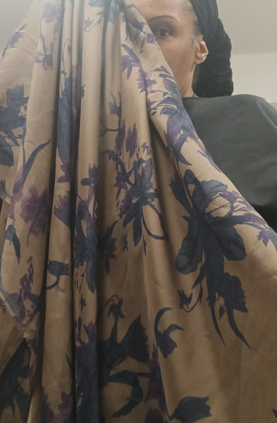 Stunning Brown Silk Scarf Printed with Beautiful Blue and Purple Water Color Flowers. Light Weight. Great Flow. Perfect Addition to Your Wardrobe.
