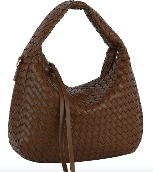 Perfect for on the go....The Aabirah Woven Shoulder bag is a cute and stylish vegan leather handbag that comes in 3 great colors. Tip Zipped closure. Gold tone hardware. Leather tie. Small interior zipped compartment, beautifully lined with geometric print lining. Comes with detachable strap.