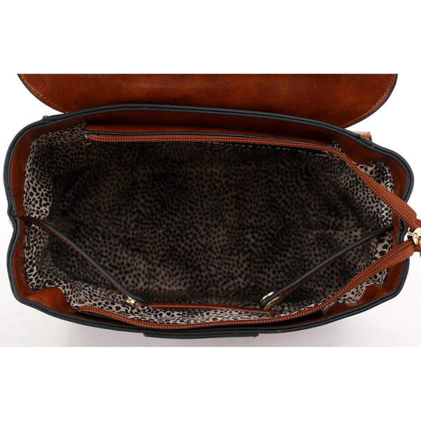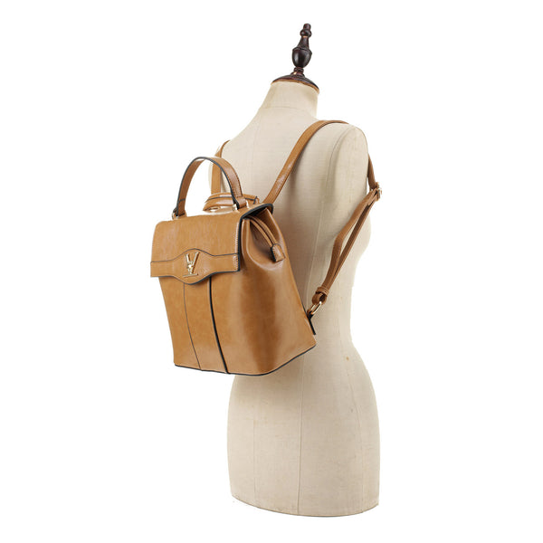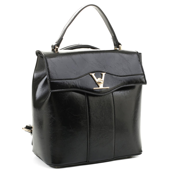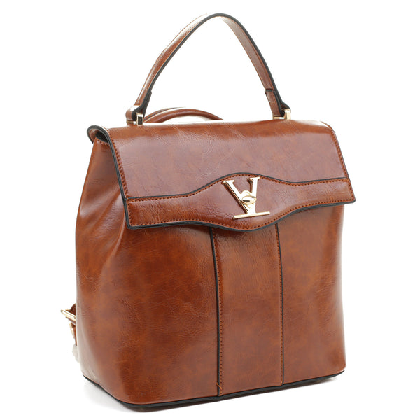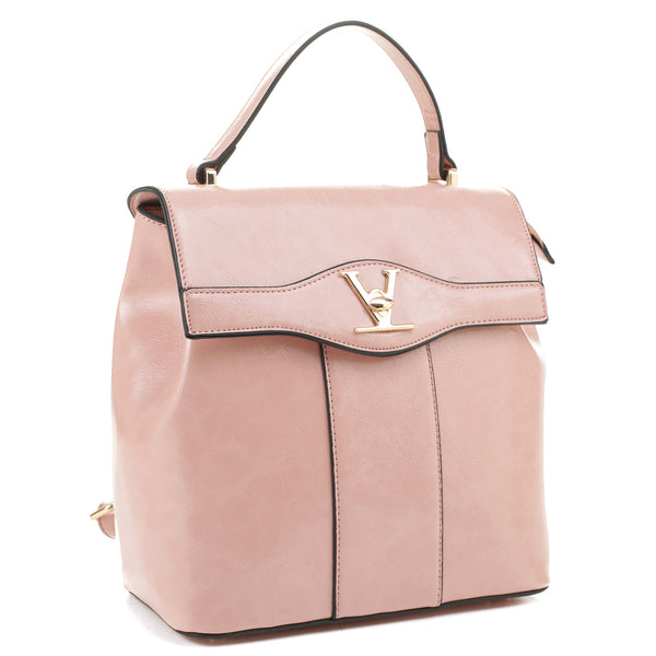 This V accent convertible backpack is a great and cute complement for your active or casual outfit. Vegan leather. Adjustable straps. Handle across the top. Zip top and back closure. Printed lining. Gold tone hardware. Can be worn as a backpack or Satchel.