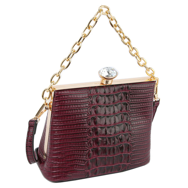 Gorgeous compact purse to add to your collection. Faux Vegan Croc Alligatore leather. Beautiful diamond shaped push lock closure. Fully lined striped interior fabric. One inner zipped compartment. Detachable shoulder strap. Gold-tone hardware.
