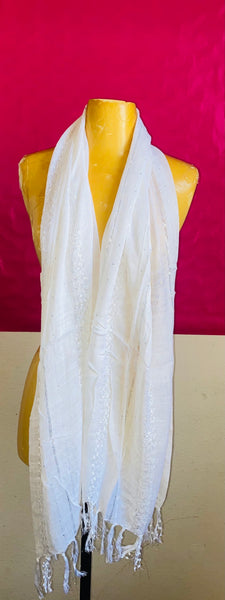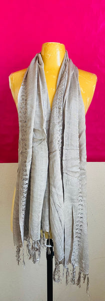 This beautiful lightweight scarf is a great complement to any outfit. Woven with accents of sliver shimmery threads and sequence. Beautiful fringes tied and knotted at the ends. Premium soft feel to touch. Breathable fabric. Non-slippery. One size fits most.